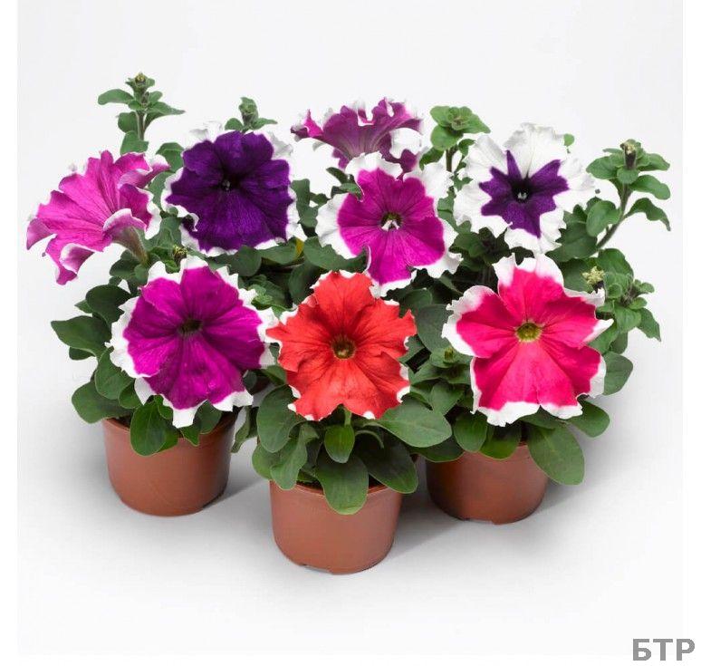 Сорт Hulahoop Mix – это завораживающее зрелище. Каждый крупный цветок диаметром около 7-7.5 см имеет насыщенный основной тон и эффектную белую кайму по краю лепестков, что создает впечатление сияния. Компактные, отлично ветвящиеся кустики высотой около 25 см формируют пышные, ровные цветущие полусферы, усыпанные десятками «граммофончиков» одновременно. Эта петуния неизменно приковывает к себе восторженные взгляды.