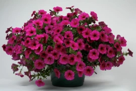 Уникальный вегетативный гибрид петунии и калибрахоа с насыщенной фиолетово-пурпурной окраской и контрастным желтым горлом. Мощное растение с полуампельным габитусом демонстрирует исключительную устойчивость к непогоде и обильное цветение. Идеально подходит для кашпо и контейнеров.