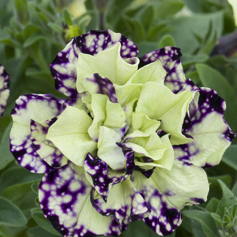 Махровая вегетативная петуния с уникальным окрасом: кремово-белые лепестки с нежно-сиреневым напылением и салатовым горлом. Компактный сорт с обильным цветением, идеально подходящий для подвесных кашпо и контейнеров.