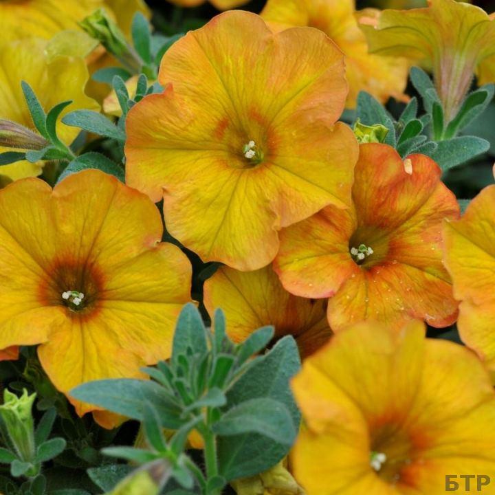 Насыщенный оранжевый гибрид петунии и калибрахоа с ярким желтым горлом. Мощное растение с полуампельным габитусом, устойчивое к дождю и жаре. Идеально подходит для кашпо и контейнеров, создавая эффект тропического заката.